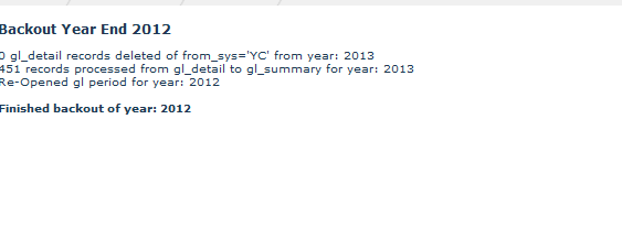 The lower section shows a summary after backout has been completed.This indicates the number of GL details deleted, records processed from GL Detail to GL Summary and confirmed that the backout has been completed.