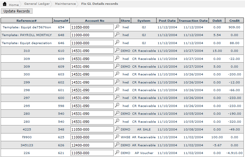 The Fix GL Details Records Screen allows amendment/update of financial statement summaries and classifications.