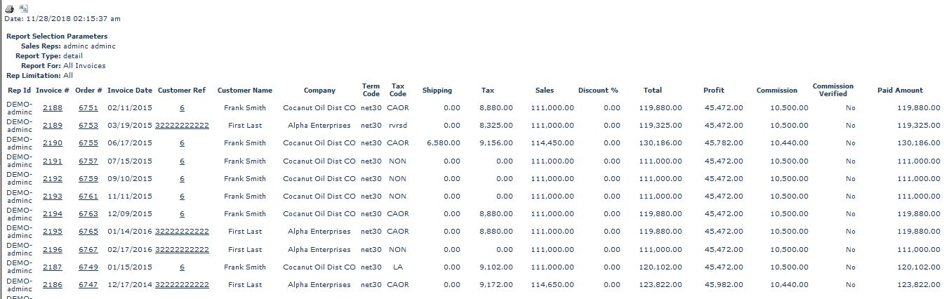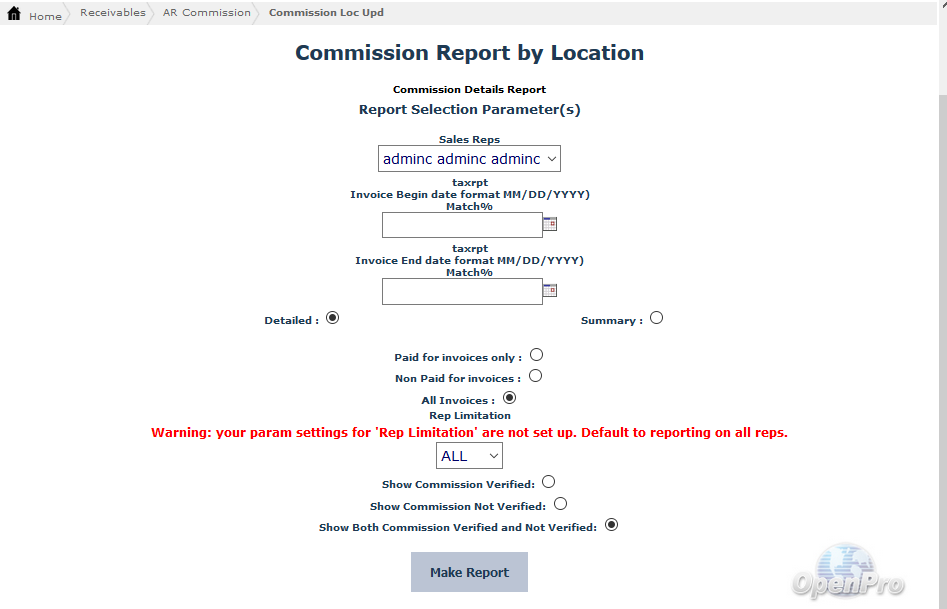 The Commission Based upon Location Rep Screen helps track commissions due based on the business locations/divisions per sales representative and you are able to set filters such as sales rep name, invoice start and end date, paid or unpaid invoices or all invoices and detail or summary of commissions report and either verified or unverified commissions.